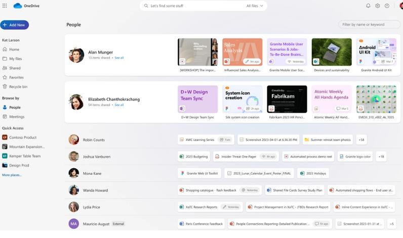 OneDrive 主页的改版已经可以使用,但是大部分新功能还在开发中。例如,“为您(For you)”部分,类似于目前的 OneDrive 消费者版,将在主页视图的顶部显示由人工智能提供的文件推荐。新的“共享”视图将显示你与合作者共同处理的文件;微软表示,这个功能将在“本季度”推出。新的“人员”和“会议”视图将让你以特定于上下文的方式查看文件,两者都将在今年晚些时候推出。